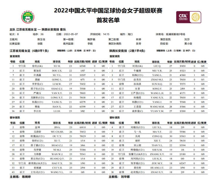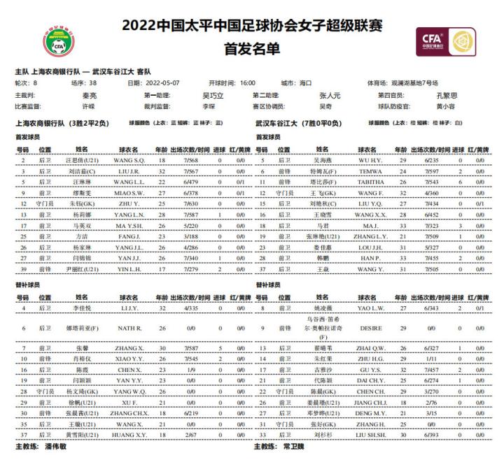 排名第一的武汉车谷江大女足对阵第四上海农商银行女足,女超传统两强的对抗也是本轮女超的焦点战+重头戏,双方都聚集众多国脚且都有强力外援加盟。上海农商银行女足首发排上了朱钰、杨莉娜、缪斯雯等国字号球员以及队长刘洁茹、小将尹丽红、汪思倩等,而张馨、李佳悦、肖裕仪等几名国脚,记忆外援娜塔莉亚作为奇兵在替补席待命;武汉车谷江大首发阵容方面,锋线上排出塔比莎和特姆瓦的黑珍珠组合,张琳艳、王晓雪、娄佳慧、马君、韩鹏、吴海燕、王飞等国字号球员出阵,替补席还有姚凌薇、翟晴苇、古雅沙、外援奥帕拉诺奇等人蓄势待发。中国足协也派出了国际级裁判秦亮领衔的裁判组执法本场比赛。