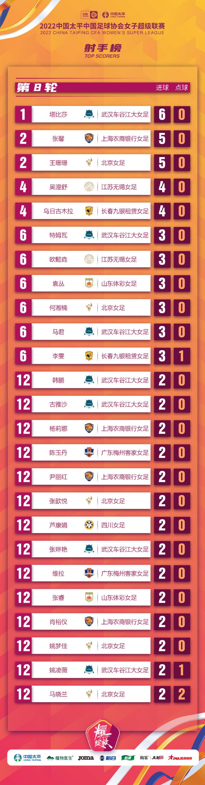 第8轮过后,武汉车谷江大女足取得八连胜,领跑积分榜,排名次席的江苏无锡女足6胜1平1负,追赶榜首的节奏放缓,山东体彩取胜后进入四强。武汉车谷江大女足阵中的塔比莎,目前依旧以6球位列射手榜头名,上海农商银行女足阵中的张馨、北京女足的王珊珊以5球紧随其后。女超第9轮比赛将于5月11日举行。