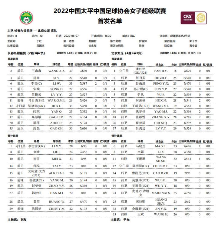 长春九银租赁女足对阵北京女足,今年女足锦标赛决赛老对手的再次碰撞,也是本轮女超的焦点对决。长春九银租赁女足首发排出了国脚高晨、宋端,以及乌日古木拉、李雯、周萍、高慧敏、吕悦云等强手,北京女足首发则排出了何湘楠、姚梦佳、张歆悦等,雪藏了国足队长王珊珊。