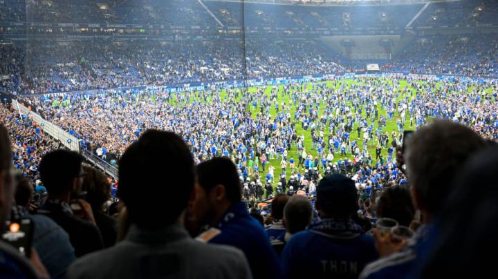 沙尔克实现重返德甲的目标,无数球迷的支持绝对是无法忽视的重要根基——即使在德乙赛场,矿工球迷依然是球队的坚强后盾。特别是赛季末,沙尔克的主场费尔廷斯竞技场几乎场场爆满。就在本轮逆转圣保利后,数万名球迷冲入场地,齐唱队歌庆祝球队重返德甲,让费尔廷斯彻底成为了蓝色的海洋……