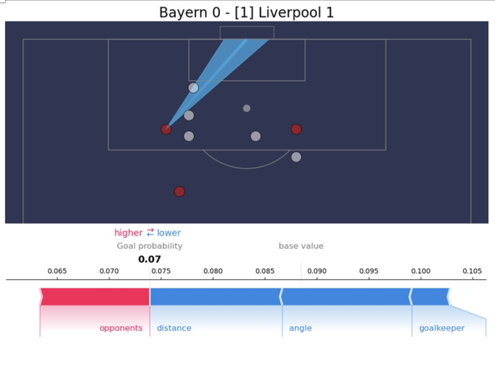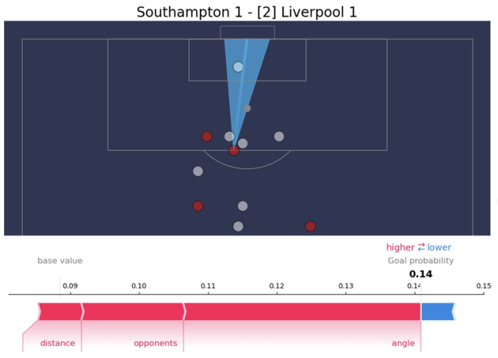 Twelve 的数据科学家 Jernej Flisar 开发了一种基于沙普利值的方法,用于计算有多少不同的因素对机会的质量有影响。在这个例子中,距离和角度(红色)是正向的贡献。马内和球门(蓝色)之间的防守人数是负向贡献。