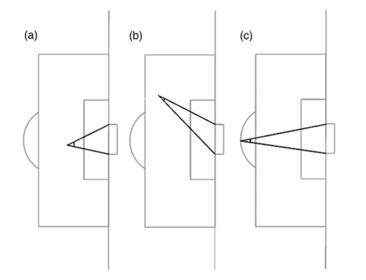 球门角度的视角如下图所示。在 (a) 中,射门点的角度与画在柱子上的两条线成 38 度角。对于 (b) 和 (c),这一角度是 17 度。