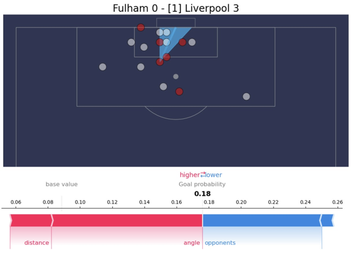 下面的示例进一步说明了这种方法背后的原则。由于射门角度有利,这种更远的距离具有更高的期望值,尽管对手在附近,但他们对射门的影响并不大。