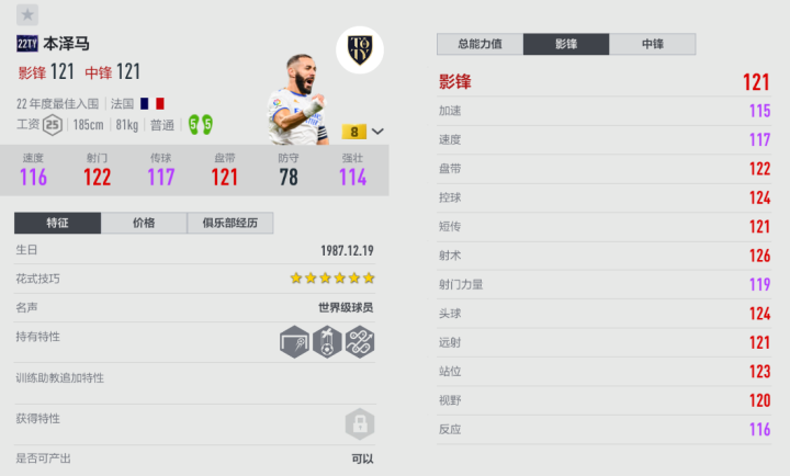 本泽马在游戏中有多张强力赛季,目前综合来说22TY依旧是其巅峰卡。本泽马是一张手感很舒适的前锋,他的控球和盘带比较细腻,被逼抢时也能护球和一脚传球转移,动作衔接流畅,没有明显的迟钝感。22TY本泽马的射术精湛,特别是禁区内的低射,成功率颇高,不妨多试试接球瞬间大力DD;由于55脚优势,他的左脚也能抽射和搓射,在外围的威胁很大。