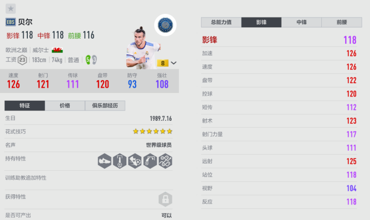 游戏中的贝尔赛季众多,主要的模型有两个,这里推荐手感更加轻盈的EBS赛季。EBS的体重只有74kg,手控时更加舒适,带球加速也会感觉更快,对比E21而言在手感上占据优势;贝尔的速度是一绝,他会频繁前插,打击对方的边路防区,以获得下底和内切的空间;贝尔搓射能力强,在禁区角附近就可以尝试兜远角,成功率比较高;由于逆足只有3,在传球和射门时,建议多用左脚,特别是他的顺足传中,“锁头”属性强。根据大家的习惯,可以给贝尔放在不同的位置,如果下底传中较多,建议首选左边前卫;如果内切搓射多,那么放在右路更舒服。