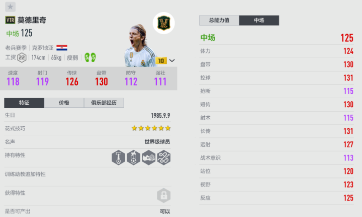 受限于模型,各赛季莫德里奇在游戏里,都不是绝对的强力热门中场,但是他也具备不错的下限,特别是丝滑的盘带手感,更是其他中场所不具备的。考虑到性价比,这里给大家介绍VTR赛季,他的平衡性强,在对抗时能踉踉跄跄地护球,不容易丢失球权;魔笛在中场可以“闪转腾挪”变向过人,从而将球推进到前场,迫使防线内收,给队友制造跑动空间;莫德里奇的直塞球很犀利,可以用双足送出威胁性传球,直塞多的玩家可以试试;魔笛招牌的外脚背在射门时也能派上用场,不管是远射和搓射,都有机会触发。