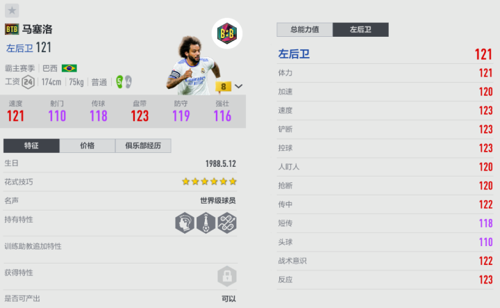 游戏里马塞洛的巅峰赛季是BTB,不过因为工资原因打左后卫困难,更建议用于边前卫和后腰。马塞洛进攻端的表现很突出,一方面他有着极为精准的边路传中能力,还能驾驭各种长短传,可以和队友进行配合;另一方面,他本身的速度快、盘带突破能力强, 可以在边路撕扯开空间。另外,马塞洛插上的远射成功率高,且对抗和围抢效果好,因此他也能出任双后腰。BTB马塞洛是一张技术特点非常全面的“万金油”,大家可以根据位置需要来灵活应用。 好了,以上就是本期“盘点皇马现役阵中的大龄球员”的全部内容介绍。当然皇马阵容里还有纳乔、克罗斯等三连冠时期的功勋,他们在游戏里也有着很好用的赛季,大家不妨多来试试,有使用过多也欢迎分享体会。