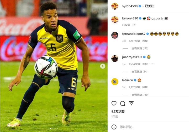卡斯蒂略最新发布的社媒已有1.6万评论,几乎所有厄瓜多尔球员都跑来底下集合团建,国家队官方账户也来加油打气