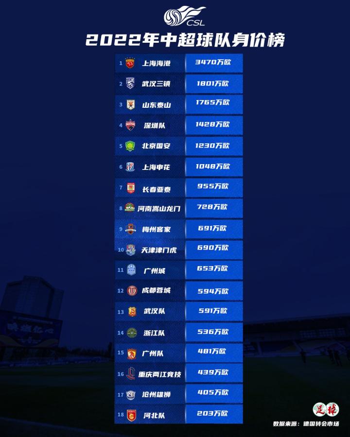 本赛季亚洲联赛俱乐部身价超过1000万欧的球队中,日本以21支球队高居榜首,韩国以13支球队紧随其后,沙特和阿联酋各自拥有10支球队,中超则只有6支俱乐部身价超过了1000万欧(上海海港、武汉三镇、山东泰山、深圳、北京国安和上海申花),领先于卡塔尔(5家)、澳大利亚(3家)和伊朗(2家)。具体到俱乐部上面,上海海港本赛季的身价是3470万欧,排名亚洲球队第三名,但却同利雅得新月的6043万欧和利雅得胜利的5570万欧有着不小的差距。