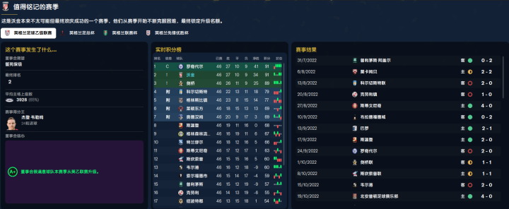 上赛季在英格兰全国联赛(英议联)挣扎,俱乐部实力与球员能力参差不齐,一个不留神就被保级球队斩于马下了,特别是客场,有时候打的我怀疑人生,看着俩中卫丢球的莫名其妙感觉像踢假球......于是在3中卫和4后卫战术之间来回切换和实验,甚至打过3313,540这些布置,最终成功升级英乙,从半职业球队转型职业球队,俱乐部换了老板接手。