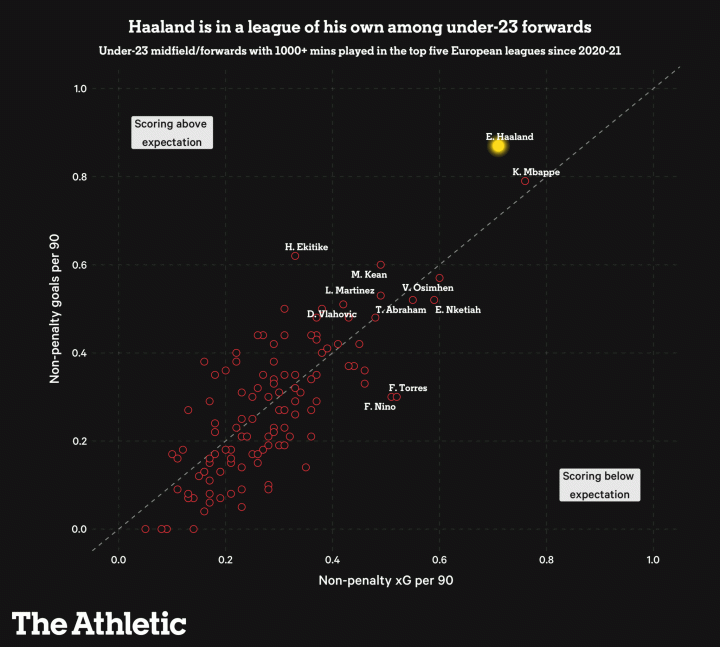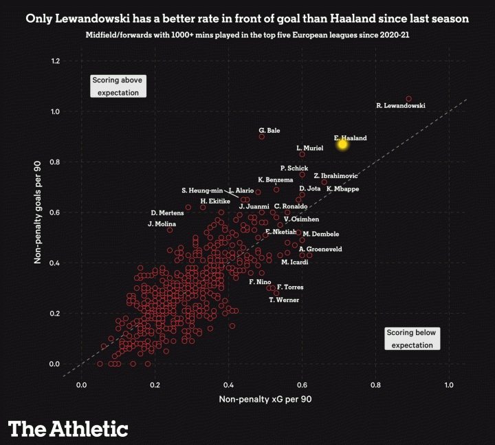 长远来看,作为一个指标,预期进球将继续发挥预测作用,但哈兰德的表现,让一切算法都苍白无力——他在多特蒙德的两个半赛季里,每个赛季的进球都高于预期。根据FBref上的统计,自2020年1月以来,相比预期进球,挪威人多进了整整12.6个非点球进球。