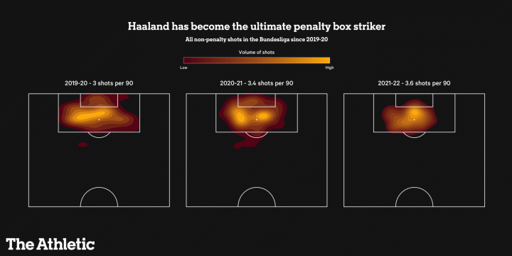 我们都知道他的品质,这种超常表现不太可能是运气,更有可能是他在训练场上刻苦训练后交出的优秀答卷。对于一个年轻的前锋来说,情况并不总是如此,但只要简单地看看他在多特蒙德的射门位置,就会发现哈兰德几乎只在禁区内射门,而且越来越多地,他射门的初始位置,就已经在球门范围以内。