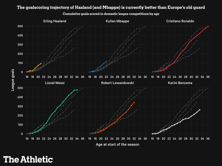 射门质量,是哈兰德能够成为顶级前锋的关键。对比上一代顶级前锋们,哈兰德的数据已经相当可观。他的进球效率,已经超过职业生涯早期的本泽马、莱万多夫斯基、C罗和梅西。这也是为何,在过去一年半里,“哈兰德+姆巴佩”这一对新一代双娇,会吸引人们的无数幻想。