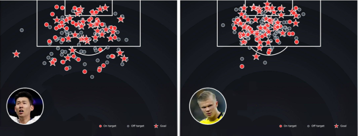(图)孙兴慜和哈兰德是本赛季五大联赛中进球转化率最高的球员,后者用159脚射门打进41球,其中有39球出现在禁区内,曼城得到了当世顶尖的禁区之王。