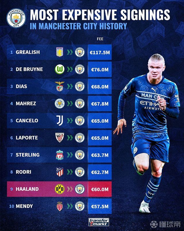 曼城历史转会身价榜TOP10,哈兰德仅排第9。
