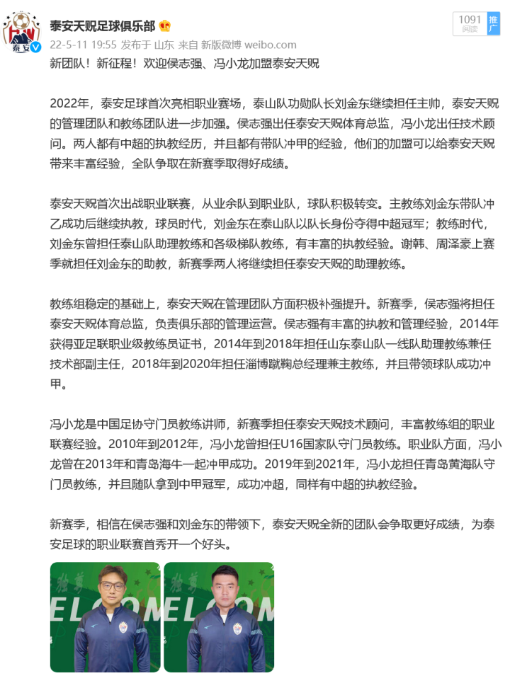 泰山晚报牛志明5月11日,泰安天贶官方宣布侯志强和冯小龙加盟,分别担任体育总监和技术顾问,提升球队的团队实力,丰富球队的职业联赛经验。新赛季,泰山队队长刘金东继续担任主教练,谢韩和周泽豪出任助理教练,全新的团队将努力在中乙赛场上一起创造好成绩。