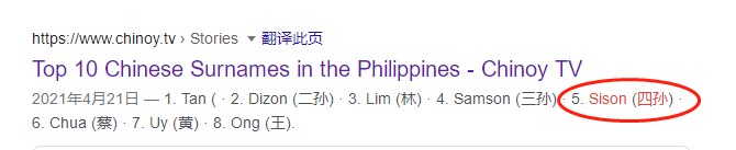 根据笔者的了解,最主要的两种来源其实都是受到西属菲律宾时期,西班牙殖民政府要求华人(尤其是福建闽南华侨)改为西班牙式姓氏的产物。第一种来源于闽南语的“四孙”,即第四个孙子的意思,这是对于华裔 西松Sison最常见的解读,其得姓始祖的情况已经不可考,甚至可能并不是同一个人。这也意味着,在那个时期,如18世纪,一些华侨大家庭为了遵从殖-民-政-府的要求,按照闽南风俗将后代改姓为:大孙(Tuason)、二孙(Dizon)、三孙(Samson)、四孙(Sison)、五孙(Gozon)、六孙(Lacson)等等。形成这种局面的情况其实并不意外,从菲律宾华侨祖籍地构成来看,菲律宾华人中至少七成以上来自不同时期的福建省,尤其是以旧漳州府、泉州府为最,在同样文化和方言背景的加成下,形成了一定程度上的规模效应。与前一种来源不同的是,第二种来源则与某一姓氏关联较高,即福建的施姓(一般拼为Sy、See、Siy等)华侨。同样是为了应对殖民政府的要求,一些施姓华侨将姓氏改成了Sison,意思就是施家的儿子,这种类型的姓氏还有Ganson(颜姓)、Siason(谢姓)等等。