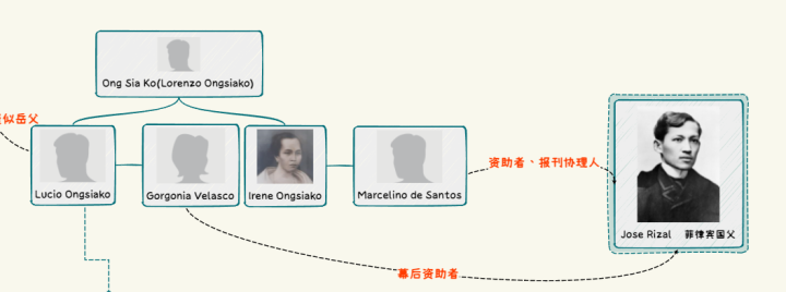 然而,进一步的调查让我们发现Lucio并不是一个简单的商人,他还是菲律宾独立运动的幕后资助者之一。1892年,有着菲律宾国父、菲律宾民族英雄之称的何塞-黎刹(Jose Rizal)自香港返回菲律宾,这位同样是福建华侨后代的眼科医生一直怀揣着菲律宾民族独立富强的梦想。在他回到马尼拉之后,接连参加了几场当地具有革命倾向的富商组织的晚宴,其中就有Lucio的妻子维拉斯科(Gorgonia Velasco),在她出面宴请黎刹之后没多久,在另外一位华侨富商的家中,黎刹组织成立了地下革命组织,菲律宾同盟会(La Liga Filipina)。不过,在相关档案当中,卢西奥夫妇并没有出现在创始成员的名单里,而是卢西奥的妹夫,马科利诺-德桑托斯(Marcelino de Santos)则名列资助人一栏,且协理黎刹创办的革命报纸。有理由相信,这样的安排应该是王家深思熟虑的结果,也是他们开始参与菲律宾-国-家-政-治的开端和试水。