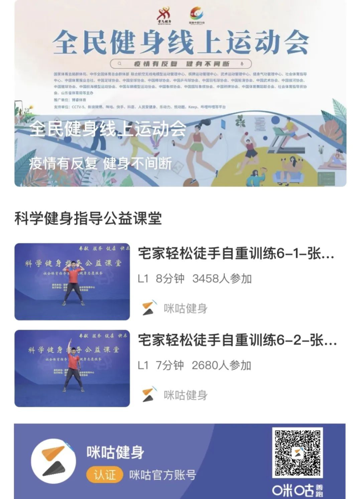 如今,全民健身的热潮已经开启,国家体育总局群体司司长丁东表示:“希望通过举办本次线上运动会,在人员不聚集、不流动的前提下,展示疫情防控常态化下全民健身开展情况,为群众提供线上展示、交流和互动的机会,丰富群众休闲生活,指导居家隔离群众开展科学健身,以体育在线服务的方式满足群众多元化体育健身需求,实现“疫情有反复、健身不间断””。