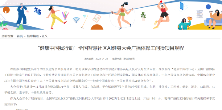 另一方面,为了带动久坐伏案的人群一起运动,此次“全民健身线上运动会”还创新地推出了“工间操时间”,每天上午10点、下午3点在部分互联网平台定时播放毽球、八段锦、太极拳、广播体操等,带动久坐、伏案的人群一起做工间操,缓解疲劳、促进健康。