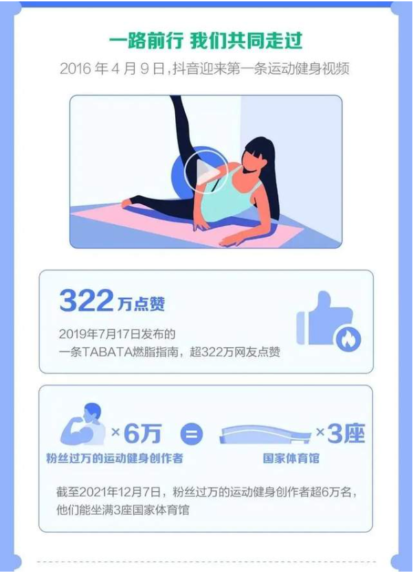 前段时间抖音发布了《抖音运动健身报告》报告显示,截至2021年12月7日,粉丝过万的运动健身创作者超6万名。疫情期间,“云健身”风靡,宅家锻炼成为人们的喜爱。2021年,健身类主播涨粉同比增加208%,运动健身视频数量同比增长134%。(抖音运动健身报告:超3亿用户参与篮球短视频互动)