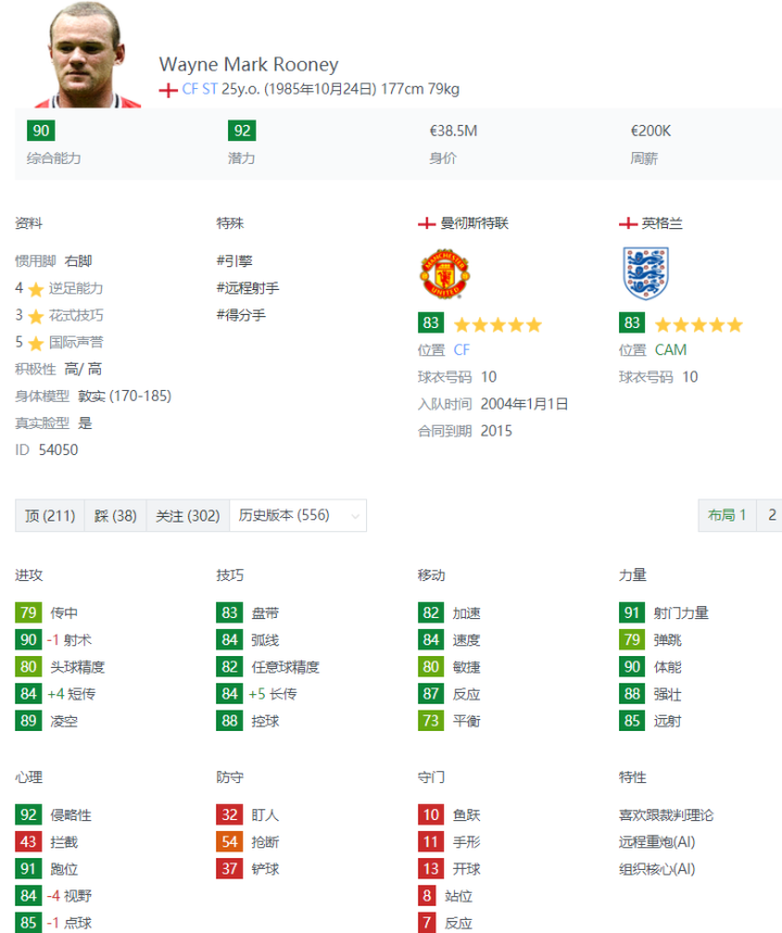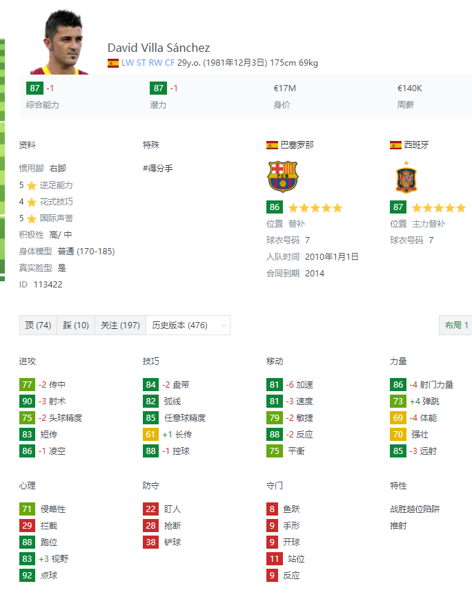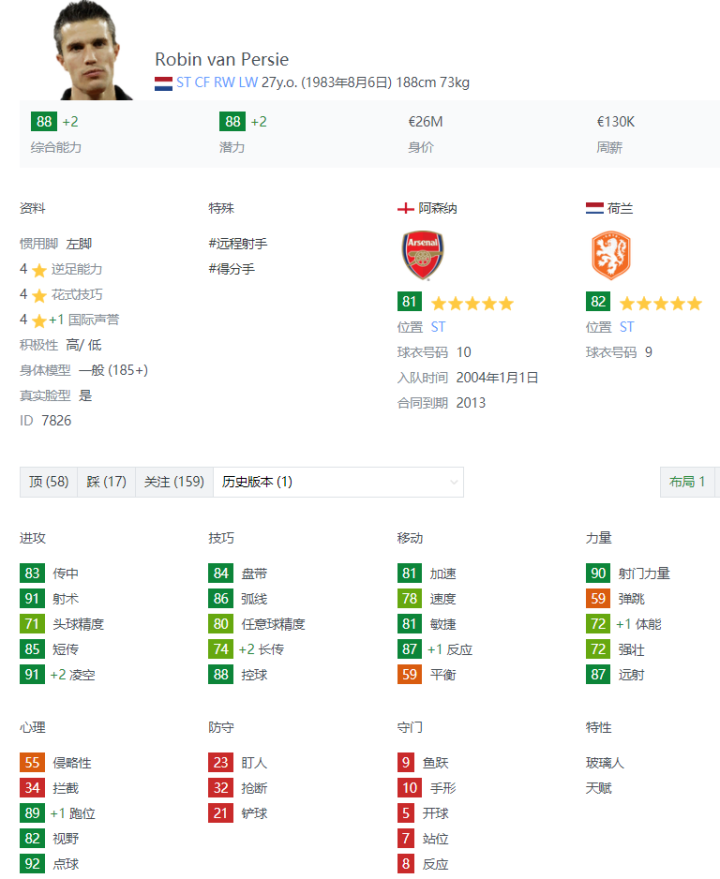 不过在FIFA12中,虽然他的能力值下降了一点来到了87,但这并不影响他在游戏中的作用,作为前锋他的射门数值依旧很高。
