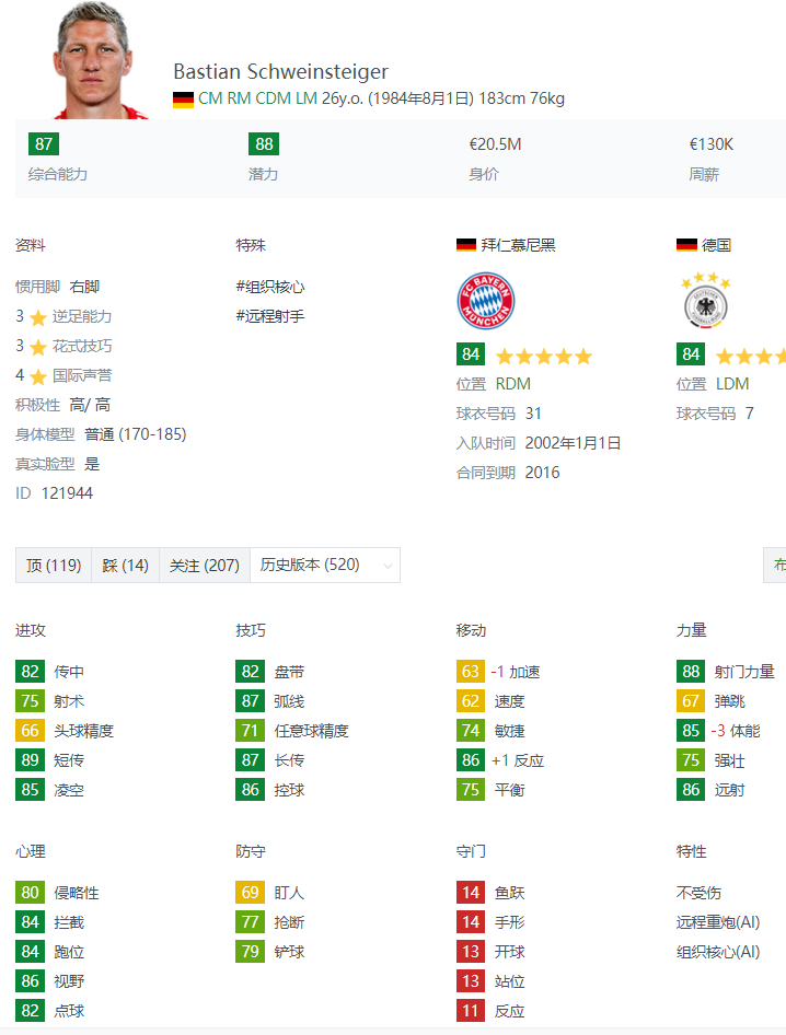2014年世界杯决赛,施魏因施泰格对于梅西的限制非常成功,作为德国历史上最伟大的中场球员之一,“小猪”在场上攻防俱佳、冷静从容,他的传球能力很强,在FIFA12中唯一的明显弱项是不超过70数值的速度能力,但这并不影响他在发挥重要作用。
