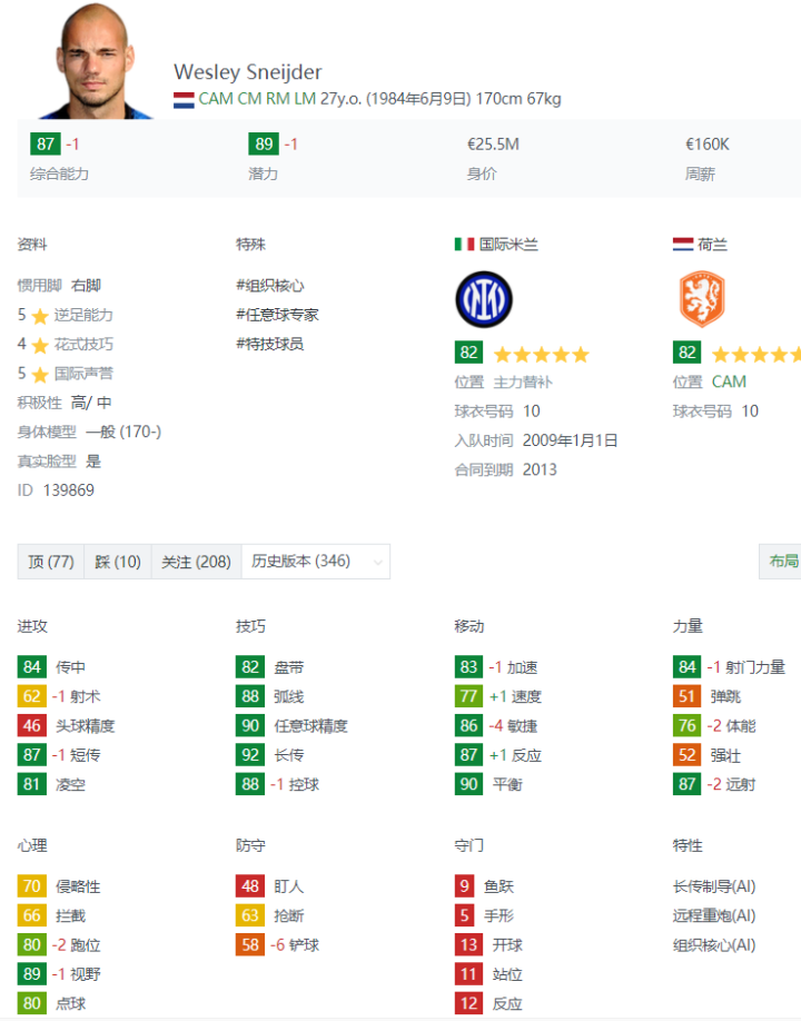 2010年国际米兰拿下欧冠冠军,斯内德功不可没。2011-12赛季斯内德仍在巅峰期,他的传球和远射能力在FIFA12中非常强大。2019年退役的斯内德,如今还未满38周岁,但他的身体已明显发福,和纳斯里并称为“慈善赛中场双雄”。