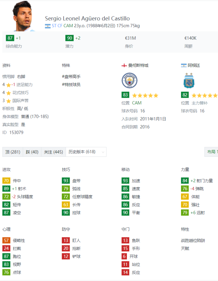 2011-12赛季是阿圭罗在曼城效力的第一年,34场23球9助攻的英超联赛数据,足以证明当时这位23岁的阿根廷小伙过硬的实力和迅速的英伦赛场适应能力。在FIFA12中,他的盘带和加速能力均高达93,是非常实用的进攻球员。