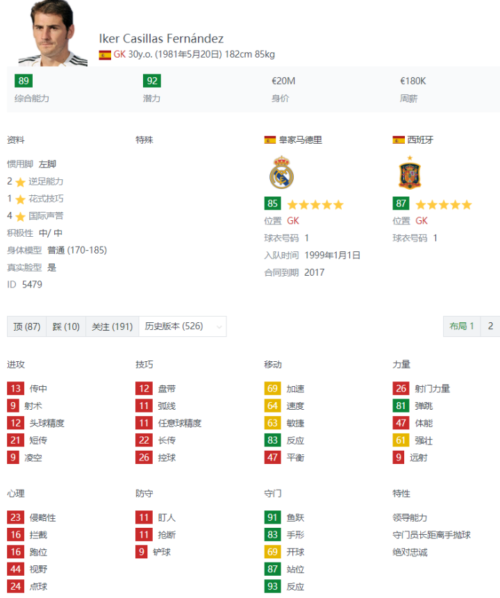 十年前的卡西利亚斯在皇马和穆里尼奥闹得不可开交,卡西也在2012-13赛季彻底失去了主力位置,但在FIFA12游戏中卡西仍然是最佳门将之一。