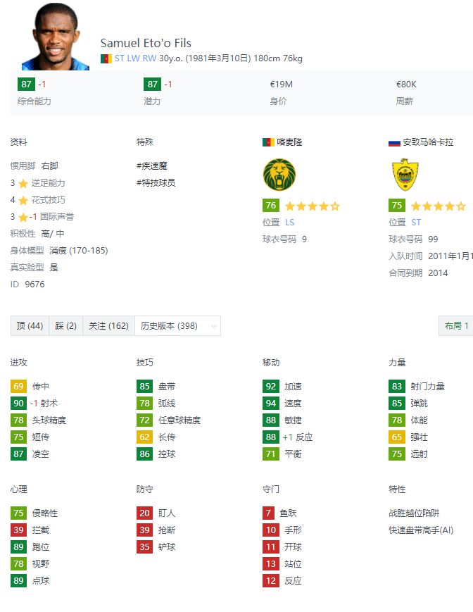 2011-12赛季在俄超,埃托奥在联赛中22次出场打进13球助攻6次,还是展现出了一名球星的水准,在FIFA12游戏中他的能力值也达到了87,两项速度数据都超过了90。
