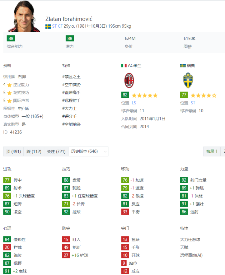 伊布可能是最全能的中锋,如果在游戏中使用双前锋的话,给伊布配一匹快马,那么两人都将起飞。2011-12赛季是伊布加盟PSG之前最后的一个赛季,他在32场联赛中打进28球,至今仍是他个人意甲单赛季进球纪录。本赛季的伊布,将再次带领AC米兰追逐意甲冠军!