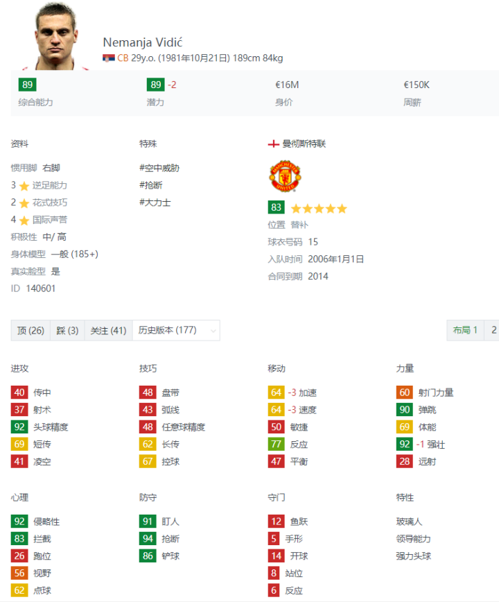维迪奇是FIFA12中能力值最高的中后卫,虽然速度只有60出头,但是他在游戏中头球精度、侵略性、盯人、抢断、弹跳和强壮数据都达到了90+,是一名非常强悍的中后卫。曾经两度获得英超最佳球员的维迪奇,深得弗格森的喜爱。