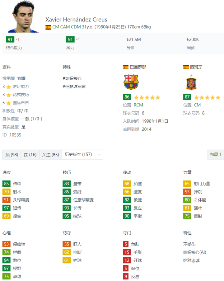 小白+哈维可能是足坛历史上最强的中场组织,在FIFA12中,两人短传数据分别为95和97,控球数值分别为94和95,视野分别为93和95,在速度和盘带数据上小白要稍高一筹。