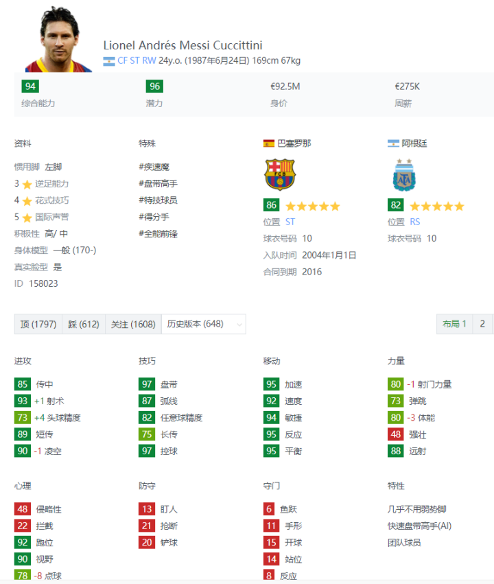 梅西在FIFA12中加速95、敏捷94、反应95、平衡95、盘带和控球都是97,巅峰梅西你怎能不爱?