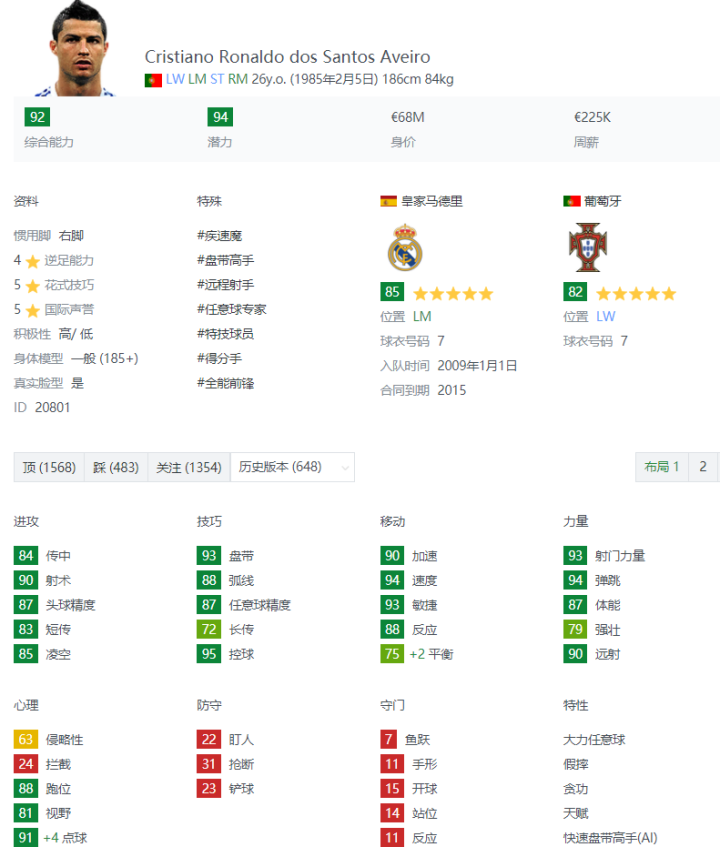 27岁的C罗在FIFA12中最快速度数值达到了94,体能也有87之高,此外他的控球也高达95,可以说C罗在游戏中是玩家们最爱的选择。