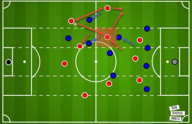 图中,控球方为了向前传球而回传、回接,正是“消极”传球的中心思想。由于左边后卫先前被盯防,他决定将球回传给中卫,而这意味着:如果对方想要逼抢持球人,就不得不随球而去,离开原本的防守位置。