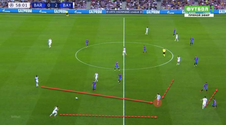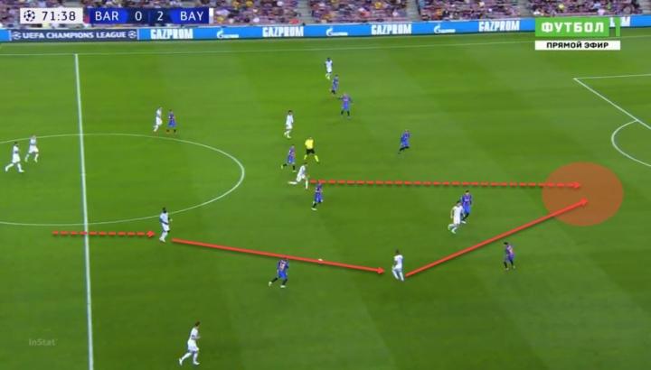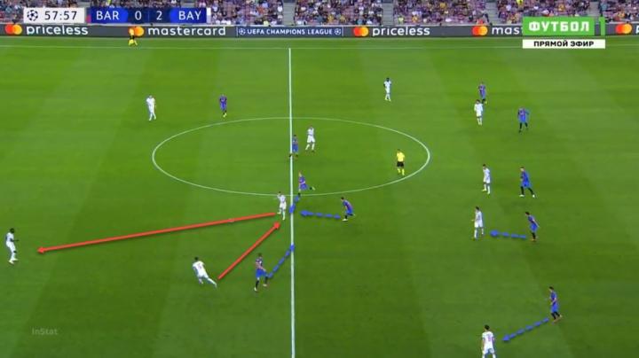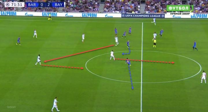 然后,一旦拜仁找到可利用的通道,便送出直传,立即加快节奏,向前推进。借助一次“消极”传球,拜仁将巴萨咄咄逼人之势化于无形,也争取了时间寻找可行的推进办法。