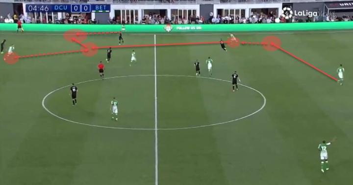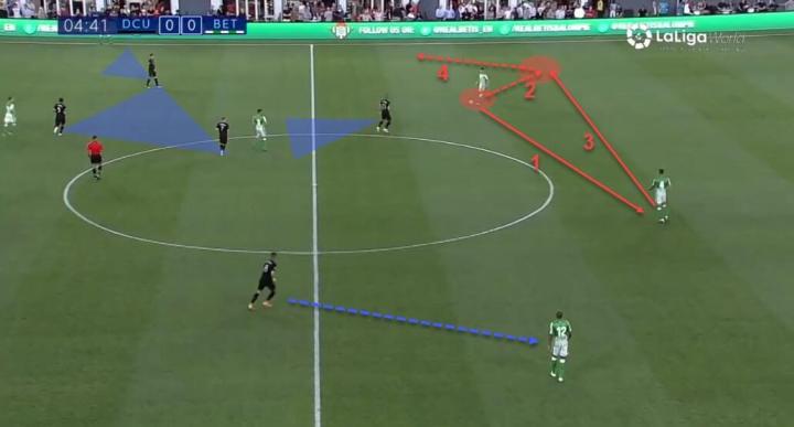 初始,贝蒂斯(身着绿白间条球衣者)一名中场队员将球回传,立即回撤到更深的位置,而他的传球吸引了对方防守队员前去压迫新的持球人,使得边路队友摆脱了盯防。对于防守方来说,为了堵住这个漏洞,最初盯防原持球人的防守队员,不得不转换盯防对象,接管这名无人盯防的贝蒂斯边路队员,从而给予了原持球人重新接球的充分空间。