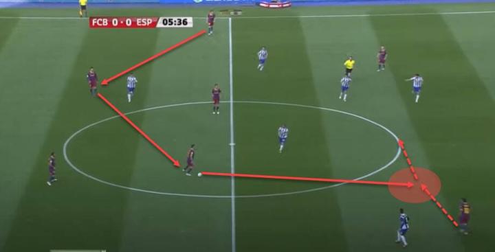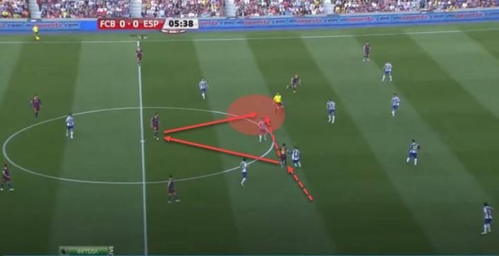 巴萨利用一次简单的回传,就实现推进并打穿西班牙人的防守阵型,放在瓜氏巴萨以前的年代,是不多见的。