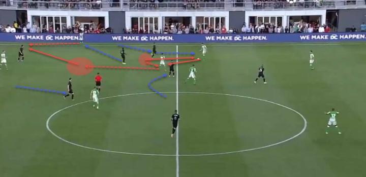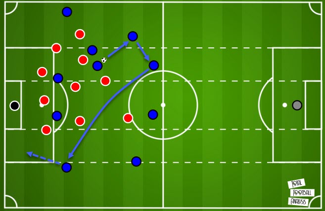 一旦进攻队员进入那狭小但关键的口袋空间,蓝队就能占据更有威胁的位置,打出精妙配合推进攻势。可见,所谓“消极”传球,有利于瓦解中低位防守阵型、创造新的间隙和空间。且不说上述这一项好处,“消极”传球对于化解对方高位逼抢,也是必不可少的一种办法。