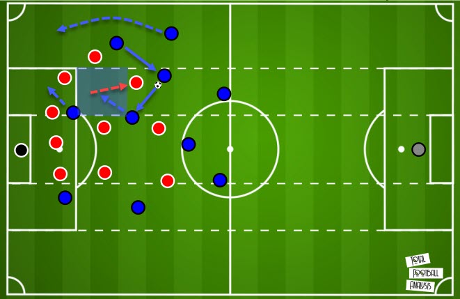 横传,就不属于任一极端——“积极”或“消极”传球。然而,很多时候,横传也是不得已为为之。而下文例子就是回传和横传的结合,进一步说明了上述观点。