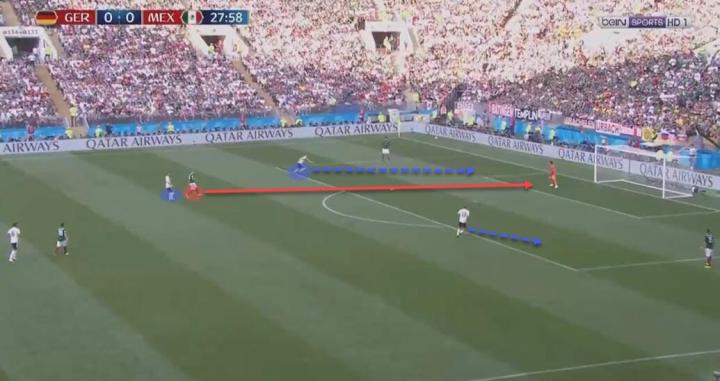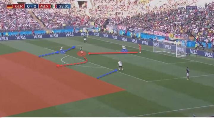 类似地,由于德国队锋线被墨西哥人的回传吸引向更高位,而锋线和中场线之间恰恰暴露了大片空当,墨西哥人正好加以利用,成功向前推进。