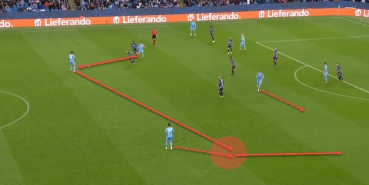 例如瓜氏曼城,通过长短结合的一系列配合在对方防守强侧创造过载,牵制对方足够多的防守人,进而孤立弱侧防守人,随之迅速转移攻势。如下图,曼城的转边是由先回传、暂时远离对方球门开始的。