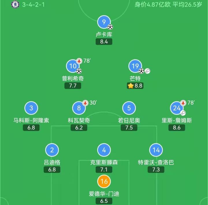卢卡库的支点作用逐渐失去,体能4天双赛体能透支的卢卡库被齐耶赫替换下场也是无奈之举,在维尔纳和哈弗茨受伤的情况下,切尔西只能以无锋阵的小快灵应对,但普利西奇和芒特的体力下降让本来就需要空间的齐耶赫显得有些独木难支,齐耶赫的推进不能造成太多的威胁,而切尔西的前场进攻也就此陷入停滞。切尔西守住了球门,双方进入加时。