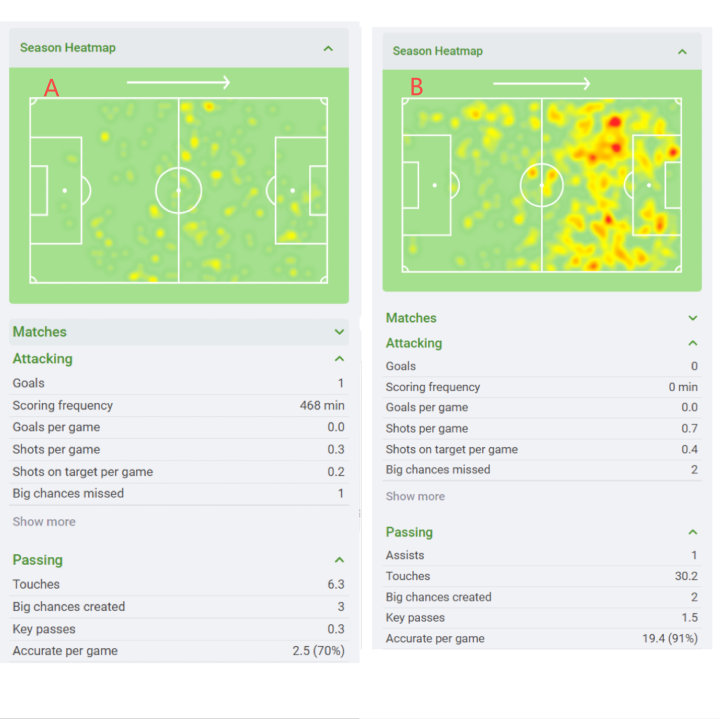 球员B:本赛季西甲出场18次,首发7次,没有进球但有1次助攻,场均射门0.7次,过人1.4次,关键传球1.5次,总计创造得分机会2次,但也错失过2次得分良机。