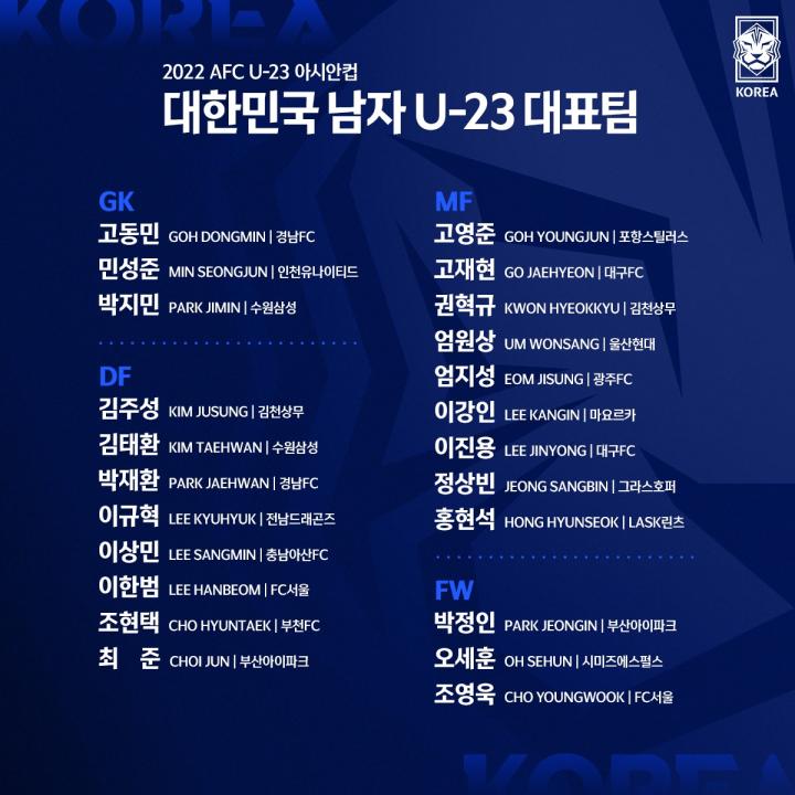 韩国队公布了参加U23亚洲杯的名单,包括4名留洋球员,5月23日全队集结前往乌兹别克斯坦。这份名单当中,最受瞩目的当属曾获U20世界杯MVP的李刚仁。主帅黄善洪介绍道,“我会把李刚仁安排在中场,给他自由人(free role)的角色,让他去自由地主导进攻”。除了李刚仁,另外3名留洋球员包括李磊在草蜢的队友郑想宾,本赛季去J联赛踢球的高中锋吴世勋,以及奥地利林茨的洪贤硕。在韩国联赛效力的球员当中,严原上、曹永旭、金泰焕等已经在K1联赛打上主力,高映埈、李珍镕等球员已经是各队固定U22首发人选。李韩汎、高在贤、赵玹泽和严志成最近成长迅速,值得关注。个人感觉比较遗憾的是,被崔龙洙重用,最近在江原FC表现突出的梁泫俊没有入选,大概率是因为江原目前锋线伤病较多。黄善洪提到,“制定这份名单时,综合考虑了六月份本托国家队的热身赛、K联赛各队具体情况,以及球员们最近的状态等因素”。具体名单如下,门将:朴智忞(水原三星),闵盛俊(仁川联),高东民(庆南FC);后卫:金朱晟(金泉尚武),李韩汎(FC首尔),李相旻(忠南牙山),朴财唤(庆南FC),李揆奕(全南天龙),赵玹泽(富川FC1995),金泰焕(水原三星蓝翼),崔俊(釜山IPARK);中场:洪贤硕(奥地利林茨),高在贤 (大邱FC),李珍镕 (大邱FC),权赫奎 (金泉尚武),高映埈 (浦项铁人),李刚仁 (西班牙马略卡),郑想宾 (瑞士草蜢),严原上 (蔚山现代),严志成 (光州FC);前锋:曹永旭(FC首尔),吴世勋(日本清水心跳),朴正仁(釜山IPARK)