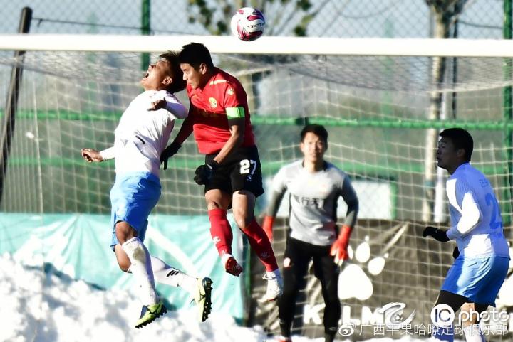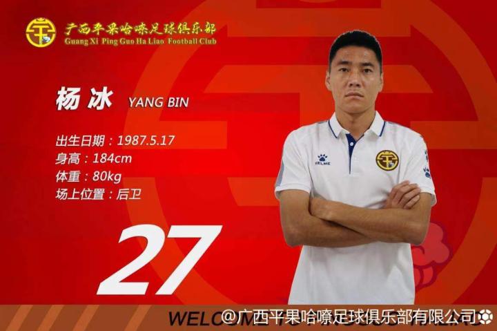 在中乙联赛,身披27号战袍的杨冰曾经先后两次效力广西平果哈嘹,司职中后卫,是球队的副队长,2019赛季杨冰跟随杨林教练加盟广西平果哈嘹的前身广西宝韵队,整个赛季出场23次,1767分钟,贡献1球和多次关键战役的解围和救险,还多次入选当轮轮最佳阵容。联赛第22轮,杨冰四人包夹中凌空爆射攻破南京沙叶河海大门,犹如马尔蒂尼灵魂附体,让柳州主场的球迷记忆犹新。在开局15连客的极端不利局面下,杨冰和队友们在杨林教练的带领下帮助广西宝韵成功保级。