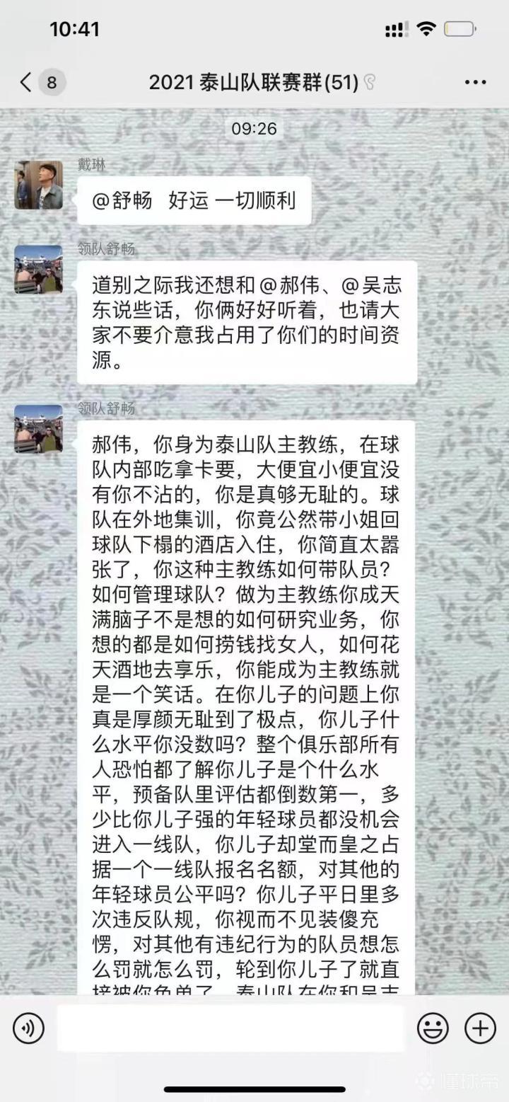 在群聊中,舒畅表示,郝伟在球队外地集训期间,公然带小姐回球队下榻酒店入住。给自己儿子一线队报名名额,其多次违反队规郝伟却视而不见装傻充楞,对别人则想罚就罚。而对于山东泰山董事长吴志东,聊天记录中舒畅称其“搞小团伙”、“以权谋私、私吞奖金”、“与郝伟沆瀣一气”等等。