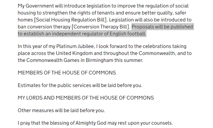 2019年英国大选正值伯里事件后不久,约翰逊政府承诺由政府引导球迷对英国足球进行治理审查,在新冠疫情和欧超风波后于去年正式落地。历经半年对130家俱乐部的走访,长达162页的调查报告被发布,最核心的主张是成立足球独立监管机构,对足球行业实行更严格的监管,已得到政府批准。
